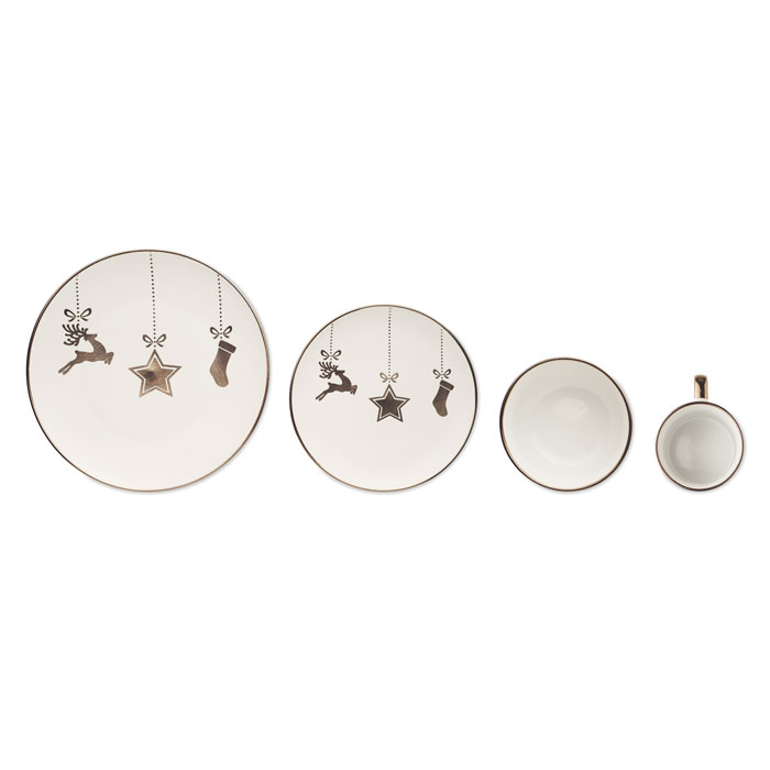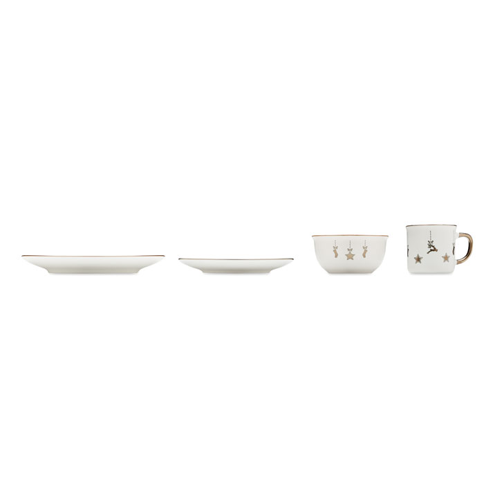4 részes kerámia karácsonyi étkészlet. Lapostányért, kistányért, tálkát (500 ml) és bögrét (300 ml) tartalmaz. Ajándékdobozban. 27,5X13X27,5 CM