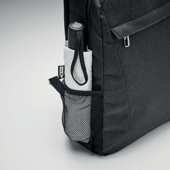 15 colos laptop hátizsák 600D RPET poliészterből. Belső laptop rekesz és több kis belső rekesz. Egy cipzáras elülső zsebbel és 2 oldalsó hálós zsebbel rendelkezik. Állítható vállpántok. Hátoldalán gurulós bőröndre illeszkedő pánttal. 43X31.5X13CM